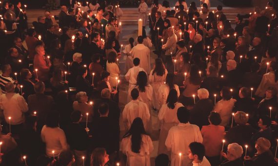 A Igreja mantém-se de vigia à espera da Ressurreição do Senhor, e celebra-a com os sacramentos da iniciação cristã. É a “mãe de todas as vigílias” que, com a sua simbologia única e singular, acende no coração dos fiéis a luz de Cristo Ressuscitado, simbolizado no Círio Pascal, do qual se acendem as velas dos fiéis, passando das trevas à luz.